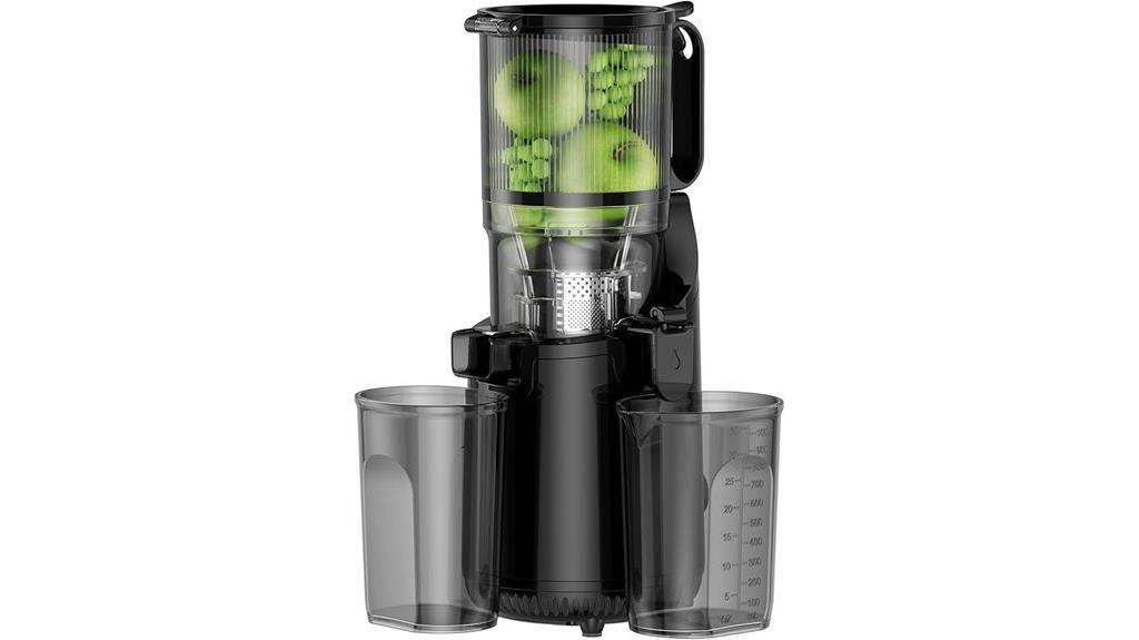 A masticating juicer machine with a large feeding chute is ideal for busy households that want to save time on prep work. Its 4.1-inch wide opening lets you insert whole fruits and vegetables, reducing chopping and speeding up juicing. With up to 98% juice extraction efficiency and a reversible auger, it maximizes nutrients and juice yield. The compact stainless steel design is durable and easy to clean, while its quiet operation creates a pleasant kitchen environment. Safety features like auto-sensing lids and anti-slip bases make it user-friendly. Overall, this juicer offers high performance, convenience, and efficiency for those seeking nutritious juice with minimal effort.