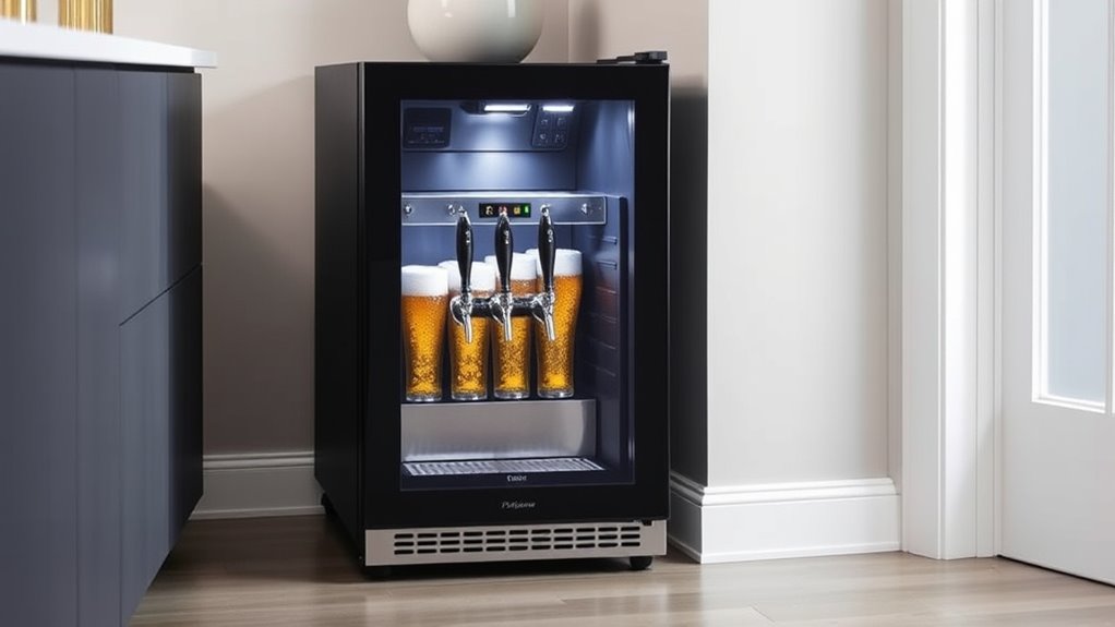 Choosing the right kegerator means guaranteeing it can handle your preferred keg sizes and types. Kegerators support various kegs, like full-size (15.5 gallons), pony (7.75 gallons), sixth barrel, or Cornelius ball lock kegs. It’s crucial to verify if the unit supports your specific keg and its fitting style, such as D system or ball lock couplers. External dimensions and internal clearance matter—measure your keg’s diameter and height to ensure proper fit. Keep in mind that some kegerators may not accommodate oversized or rubberized kegs from brands like Coors or Miller, which often need specialized units. Ultimately, consider if the kegerator allows easy conversion between keg types and has adjustable shelves or removable parts for flexible compatibility.