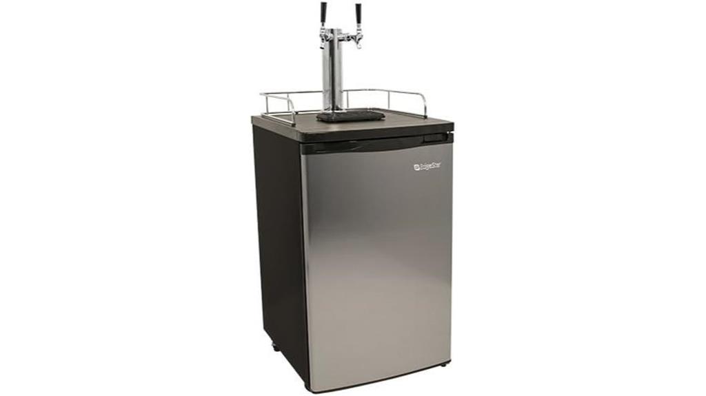 Designed specifically for home brewers, the Kegco HBK309S-2 offers a sleek stainless steel finish and dual taps that let you dispense two different beers simultaneously. It features a reversible door, removable guardrail, and a digital LED temperature display, making it easy to control and customize. Compact yet versatile, it fits various keg sizes and can store additional items like fermenting buckets or food. The complete dispense system includes a stainless steel tower, regulator, and CO2 cylinder. While setup can be challenging initially, reviews highlight its attractive styling and dual-tap convenience. Proper assembly and maintenance guarantee consistent performance for home brewing enthusiasts.