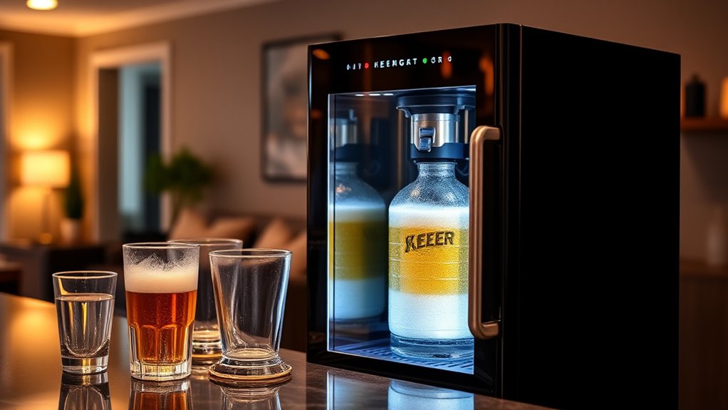 If you’re looking for the best kegerators for reliably cold drafts at home in 2025, I recommend models like the EdgeStar KC2000, Kegco K309B-1, and Danby Double Tap for their solid cooling performance, versatile keg capacity, and user-friendly features. These units come with adjustable temperature controls, complete tap systems, and sleek designs that fit various spaces. Keep an eye on factors like size, setup ease, and maintenance—if you’re curious, I’ll show you the top picks that stand out.