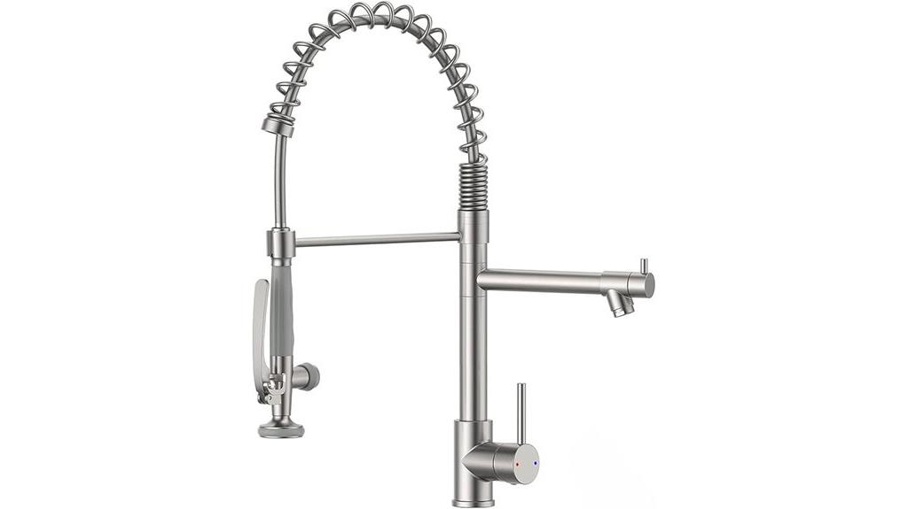 For anyone seeking a durable and stylish kitchen faucet with versatile functionality, the Fapully Kitchen Sink Faucet with Sprayer stands out as an excellent choice. Its all-metal body, brushed nickel finish, and high arc design create a sleek, industrial look that enhances any kitchen’s aesthetic. The faucet offers a pull-down sprayer, pot filler spout, and 360-degree swivel, making multitasking effortless. Built from stainless steel with tested ceramic cartridges, it promises long-term durability. Easy to install and maintain, many users praise its strong water pressure, convenience, and modern appeal. Customer support is responsive, ensuring a satisfying experience for years to come.