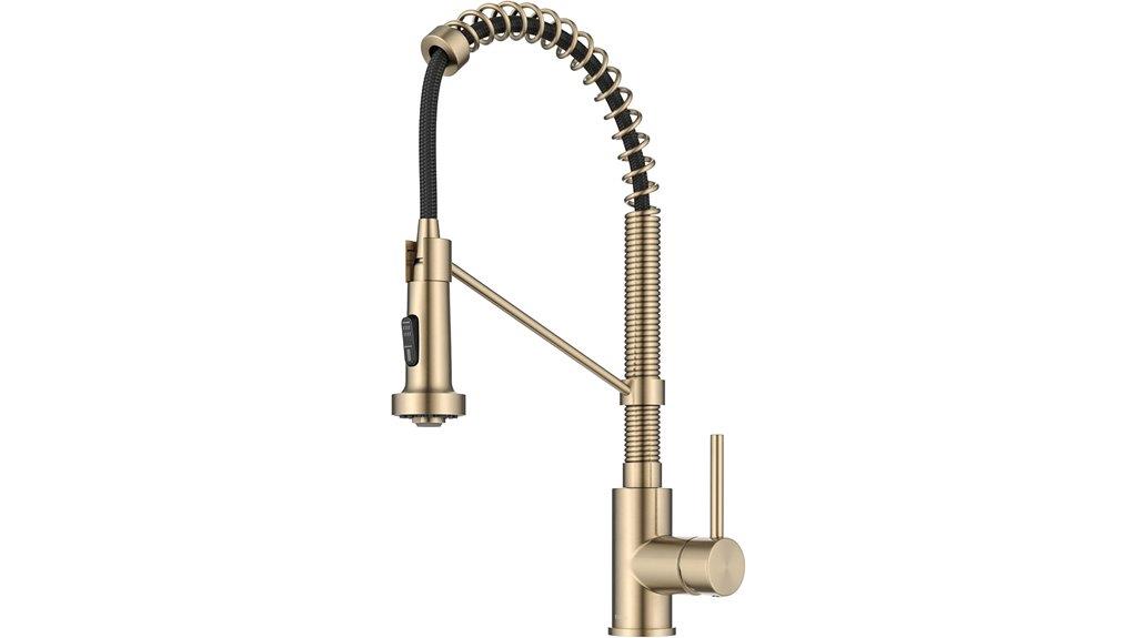 The KRAUS Bolden Commercial Kitchen Faucet in Antique Champagne Bronze stands out with its modern, professional design that combines durability and style. Its high-arc open-coil spring spout offers a sleek look, perfect for any kitchen or laundry room. The spot-free finish resists water spots, fingerprints, corrosion, and fading, making cleaning effortless. With a 6.25-inch spout height, 8.63-inch reach, and 180° swivel, it delivers excellent functionality. The dual-function pull-down spray offers stream and spray modes, while Reach Technology ensures easy maneuverability. Built with heavy-duty materials and simple installation, this faucet is a stylish, reliable addition to any modern kitchen.