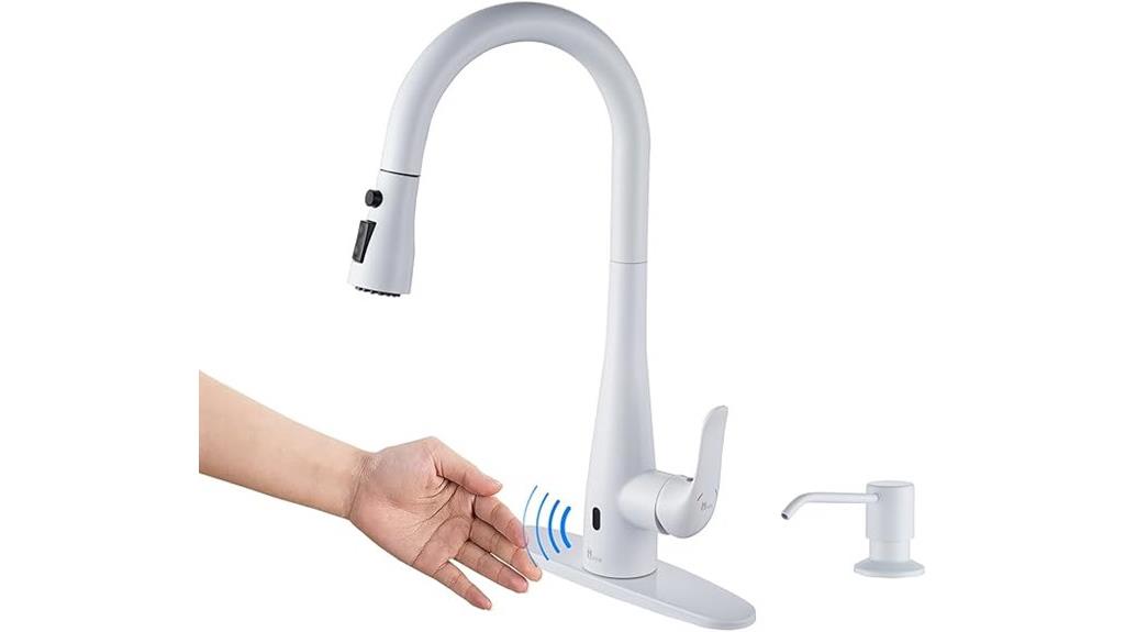 A pull-down touchless kitchen faucet with soap dispenser and sprayer is ideal for busy households that value convenience and hygiene. I love how its sleek matte white finish complements modern decor, while the durable stainless steel ensures longevity. The 17-inch pull-out hose offers excellent reach, and the 360° swivel spout makes multitasking easy. With sensor activation, I can operate it hands-free, reducing mess and cross-contamination. The spray head provides three modes—standard, jet, and pause—so I can handle any task effortlessly. Easy to install and maintain, this faucet combines style, functionality, and efficiency, making it a smart choice for a busy kitchen.