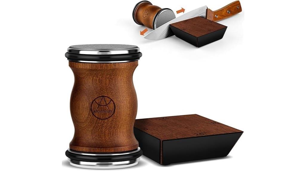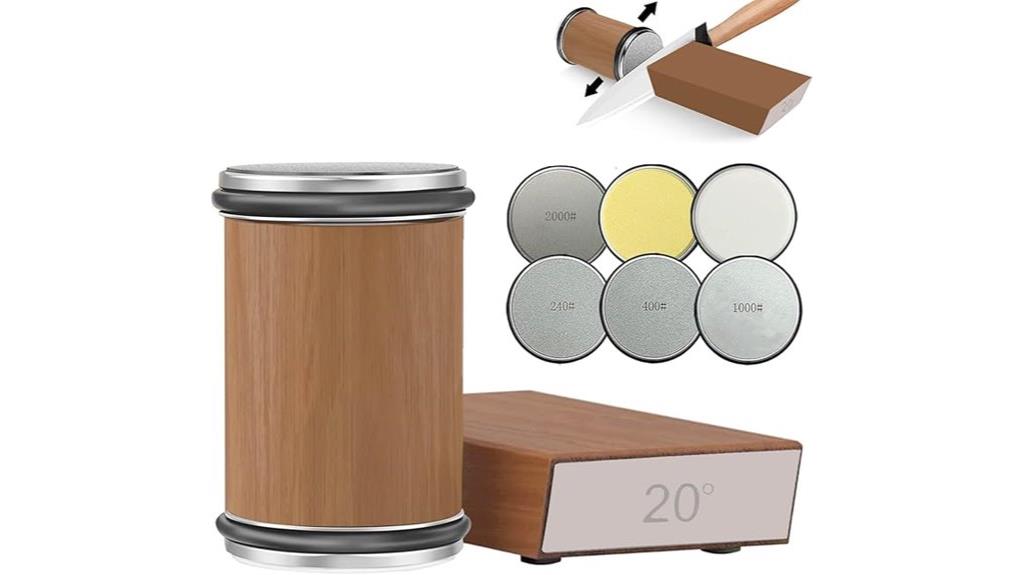 If you’re looking for a versatile and precise sharpening system, the Rolling Knife Sharpener Kit with Diamond & Corundum Discs stands out. Made from durable natural rubber wood, it features strong magnets that securely hold your knives at fixed angles of 15 and 20 degrees, ensuring consistent results. The kit includes four diamond discs (240-2000 grit) for repair, sharpening, and polishing, along with two corundum discs (600 and 3000 grit) for fine finishing. It’s simple to use—just attach the discs, fix your knife, and pull. Plus, its safe design keeps your hands clear of blades, making sharpening quick, effective, and worry-free.