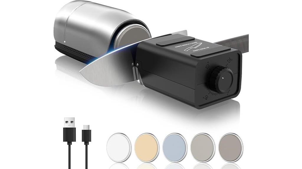 The Upgraded Electric Knife Sharpener Kit with Discs & Precision Djust stands out as an ideal choice for both home chefs and outdoor enthusiasts seeking versatile, professional-grade sharpening. Its cordless design, three adjustable speeds, and one-touch operation make it easy to use and highly adaptable. The kit includes five replaceable discs—diamond, whetstone, and ceramic—allowing quick touch-ups, polishing, and blade restoration. With a vintage aesthetic, portable build, and secure magnetic base, it’s perfect for various settings. The adjustable sharpening angles and silent rolling mechanism ensure precise, safe, and efficient sharpening, making it a valuable tool for anyone serious about maintaining razor-sharp blades.