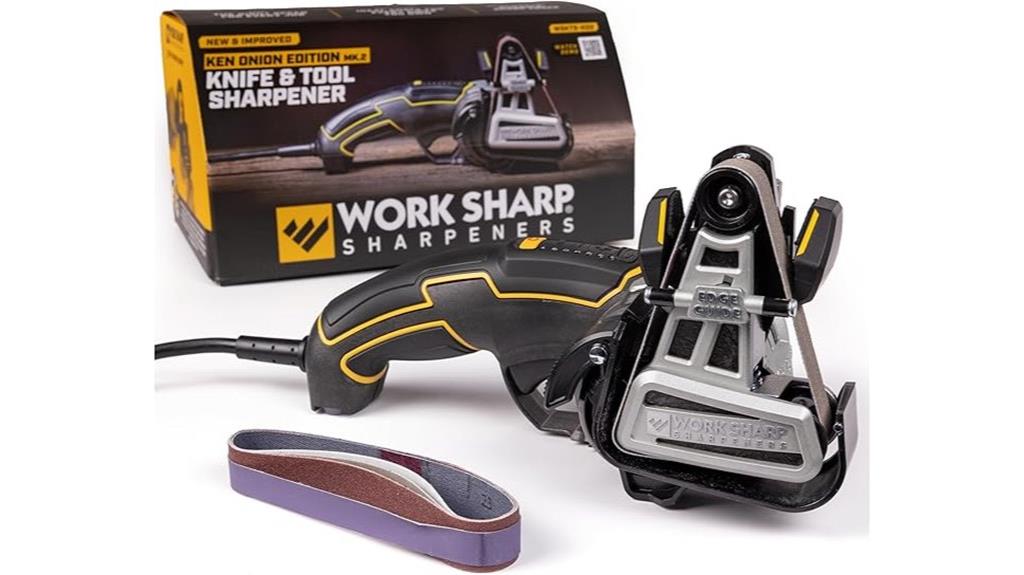 When seeking a versatile and efficient sharpening system, the Work Sharp MK2 Electric Knife and Tool Sharpener stands out with its adjustable angle system, making it ideal for both home cooks and professionals. It features flexible belts that conform to blade edges, suitable for sharpening kitchen knives, outdoor tools, serrated knives, scissors, and lawnmower blades. The two-speed motor offers control for heavy-duty tasks, while intuitive controls and easy belt changes simplify operation. Made from durable stainless steel and designed in Oregon, it delivers professional results quickly. Users praise its speed, versatility, and ease of use, making it a top choice for maintaining sharp blades with minimal effort.
