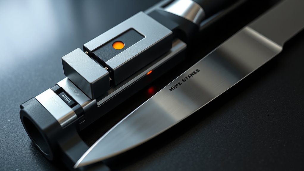 Adjustable angle features are essential because they give you precise control over the sharpening bevel, ensuring your blade gets the exact edge you want. With these systems, you can set the sharpening angle anywhere from about 15° to 30°, which works for different blade types and personal preferences. This flexibility helps create consistent, symmetrical edges, boosting both sharpness and blade longevity. It also allows customization for specialty knives like Japanese santoku or Western-style chef knives, ensuring proper edge geometry. Fine-tuning the angle reduces the risk of over- or under-sharpening, giving you better control over the final edge. Plus, adjustable systems support various sharpening techniques—reprofiling, honing, and polishing—making them versatile tools to meet different blade needs efficiently.