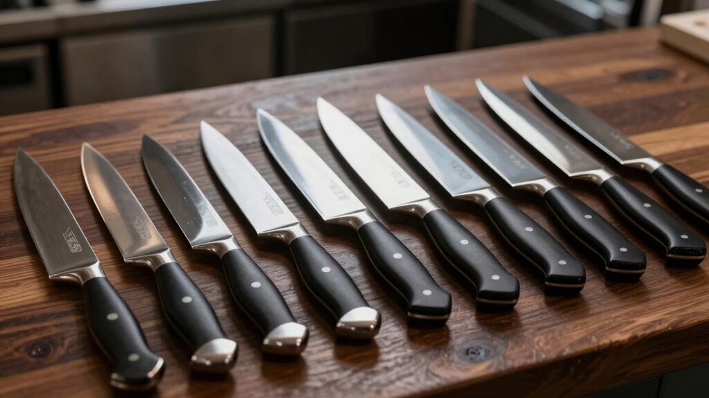 Did you know chefs handle an average of 10,000 ingredients a year? To choose knives for various cuisines, I look for versatility. I pick a sharp, flexible paring knife for delicate tasks, a sturdy cleaver for meats, and a versatile chef’s knife for everything else. I also consider the cuisine’s style—Japanese knives for precision, German for robustness—ensuring I have the right tools to bring out authentic flavors.