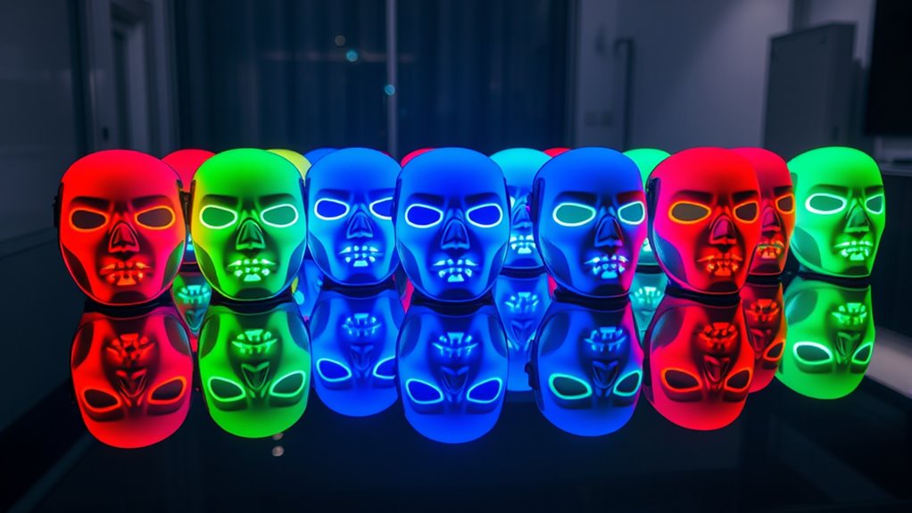 Imagine sinking into a warm, calming glow that targets your skin’s deepest concerns. I’ve seen LED masks do wonders for acne and wrinkles—red light boosts collagen, while blue fights bacteria. With regular use, I’ve noticed clearer skin and smoother texture. They’re effective for specific issues, but consistency is key. Just remember, I always advise checking with a dermatologist to tailor treatments to your skin’s unique needs.