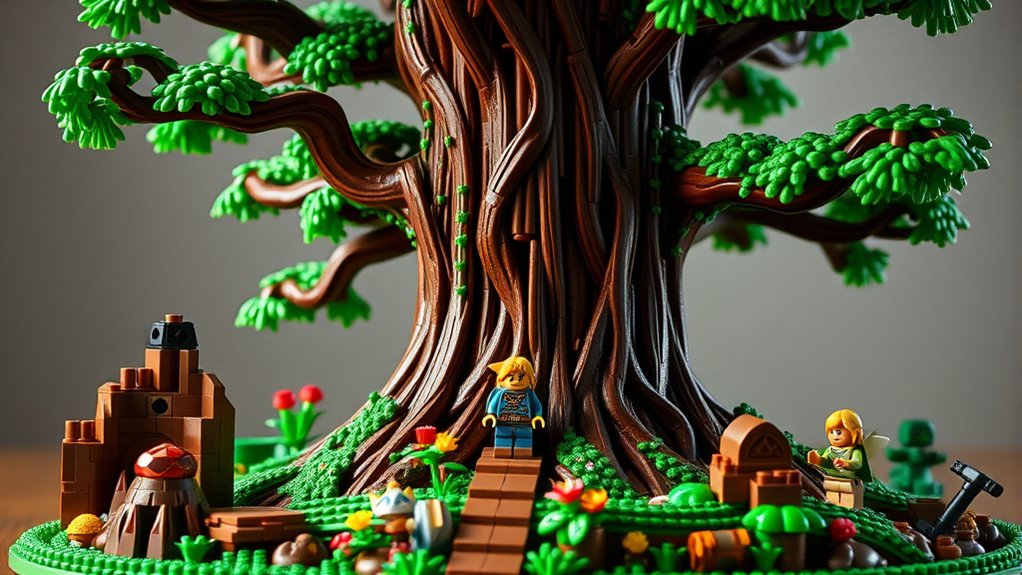If you’re looking to bring Hyrule’s magic to life, the best LEGO Zelda Great Deku Tree sets and accessories are incredible choices. I recommend options like the BrickBling and YEABRICKS LED lights to brighten your display, while custom acrylic cases keep everything protected and dust-free. For added charm, consider detailed builds like the Koroks set or the calming Nifeliz Bonsai Tree. Stay with me to explore all the top picks that will transform your Zelda collection.