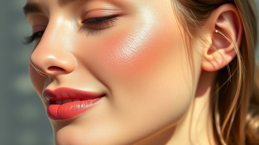 The finish and texture of a luxury cream blush play a essential role in achieving a natural look, as they directly affect how seamlessly the product blends with your skin. A finish can range from matte to dewy, with dewy formulas adding a radiant, hydrated glow that enhances a healthy appearance. Cream blushes typically offer a smooth, velvety texture that melds effortlessly into the skin, creating a fresh, natural look. Lightweight, buildable textures are ideal—they allow you to layer color without feeling heavy or cakey, maintaining a skin-like feel. The blending capability is fundamental; highly blendable formulas ensure a seamless transition, making the blush look like a natural flush rather than a visible layer of makeup. Choosing the right finish and texture is key to a flawless, natural glow.