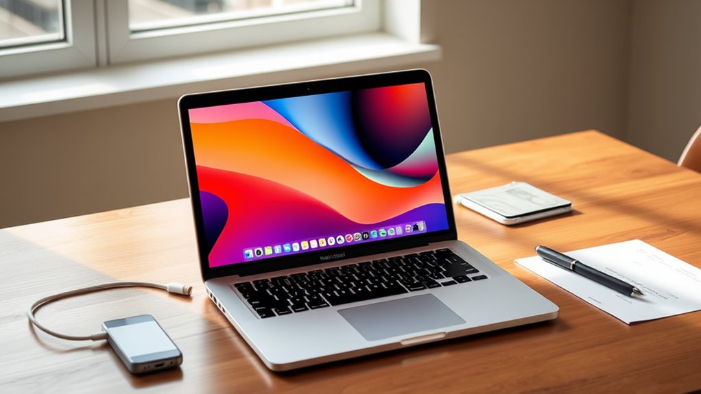 Privacy and security are essential considerations when selecting a MacBook Air, especially for students and creators who handle sensitive information. Apple’s models incorporate advanced hardware-based security features that protect data from unauthorized access. Touch ID allows for quick, secure logins, reducing the risk of device breaches. Apple’s privacy-focused design guarantees personal data remains protected, even from Apple itself, through on-device processing and data minimization. Security updates and encryption are seamlessly integrated into macOS, providing ongoing protection against emerging threats. Plus, users can customize privacy settings to control app permissions, location sharing, and data access, giving full control over personal information. These features make the MacBook Air a reliable choice for safeguarding sensitive work and personal data in today’s digital world.