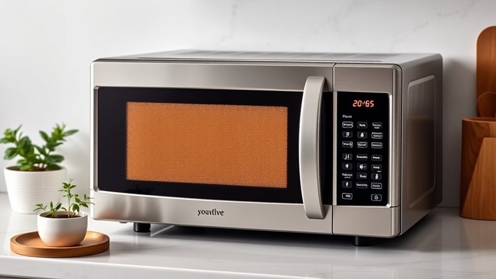 The wattage of a microwave directly impacts how quickly and evenly it cooks your food. Higher wattage models, like 1000W or above, typically deliver faster, more uniform results. Most microwaves range from about 700W to 1200W, with higher wattage meaning quicker reheats and better defrosting. Choosing the right wattage depends on your needs—if you want fast, efficient cooking, go for a higher wattage. Many models also feature adjustable power levels, giving you control over heat output for different tasks. Inverter technology further enhances performance by providing consistent power at various settings, which improves cooking quality. Picking a microwave with appropriate wattage guarantees you get quick, even results without sacrificing control or precision.