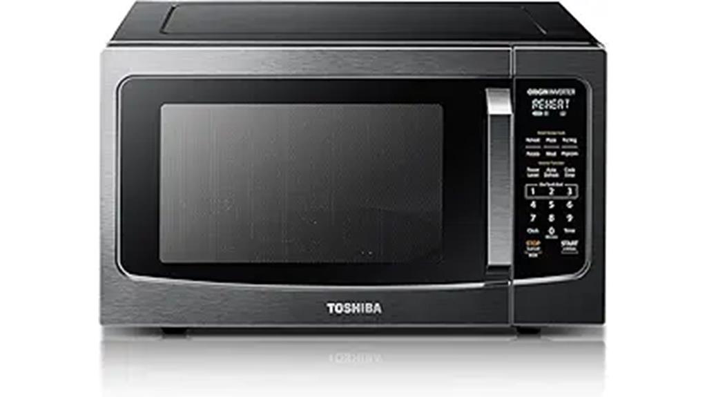 The TOSHIBA Microwave Oven with Inverter Technology stands out for those seeking fast, even heating and versatile cooking options. With a spacious 1.6 cu. ft. capacity and a powerful 1250W output, it heats food quickly and thoroughly. Its sleek black stainless steel design adds a modern touch to any kitchen. Inverter Technology guarantees consistent heat distribution, improving defrosting and cooking speed. It features smart sensor auto menus for perfect results on popular foods like pizza and vegetables. Additional functions include auto defrost, quick start, and an eco mode. User-friendly controls, safety features, and silent operation make this microwave a top choice for reliable, efficient, and versatile cooking.