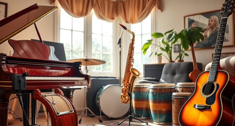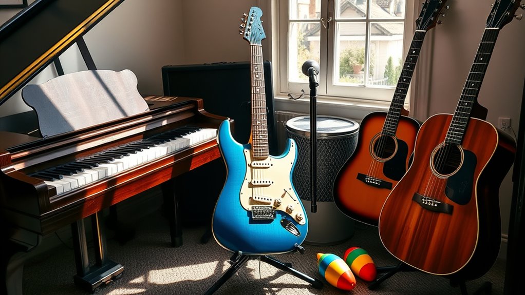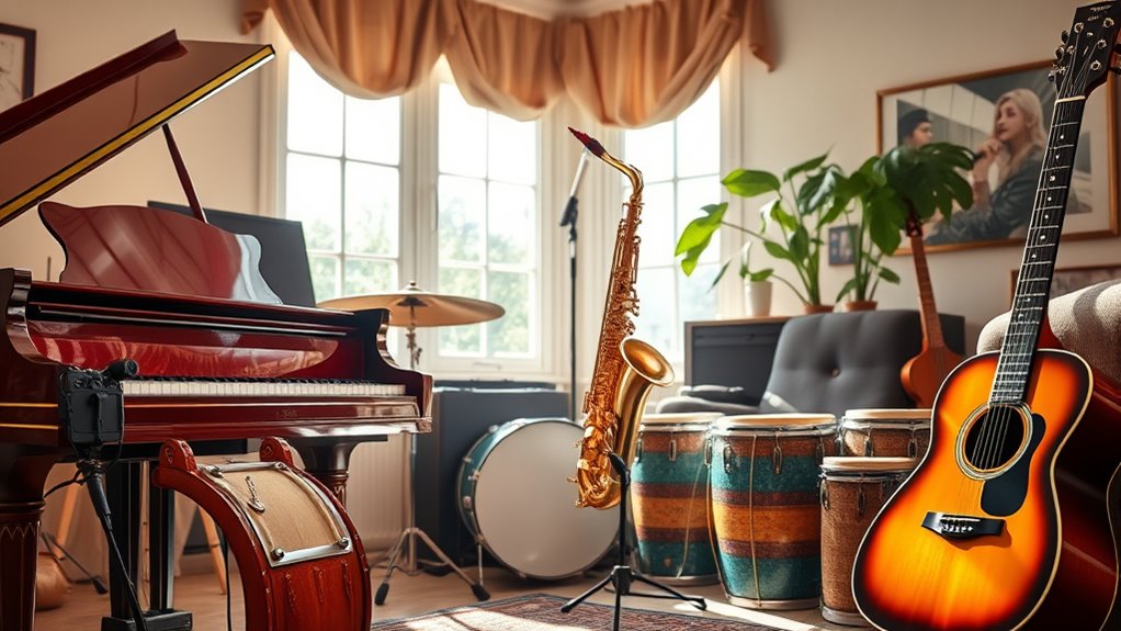 If you’re looking for the 15 best musical instruments to spark your creativity, I recommend starting with beginner-friendly options like kalimbas, tongue drums, and the Otamatone for fun and easy learning. Instruments like trumpets or harmonicas add variety, while electronic toys boost spontaneity. Each of these options offers something unique to inspire your musical journey. Keep exploring, and you’ll discover even more ways to create and express yourself with music.