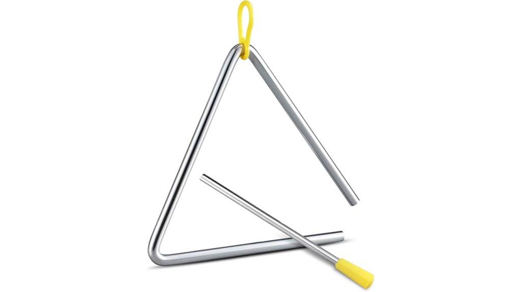A 6-inch steel hand percussion triangle with a striker stands out as an ideal instrument for beginners and educators alike, thanks to its clear, bright sound and durable construction. Made from high-quality steel, it offers exceptional sound clarity and resilience for frequent use in various settings. The vibrant yellow rubber hanger not only adds visual appeal but also helps improve hand-eye coordination, especially for kids. The detachable hanging ring makes it easy to attach or hold during play. Plus, it comes with a striker, so you can start exploring rhythms and tones immediately. This versatile instrument is perfect for educational settings and musical experimentation alike.