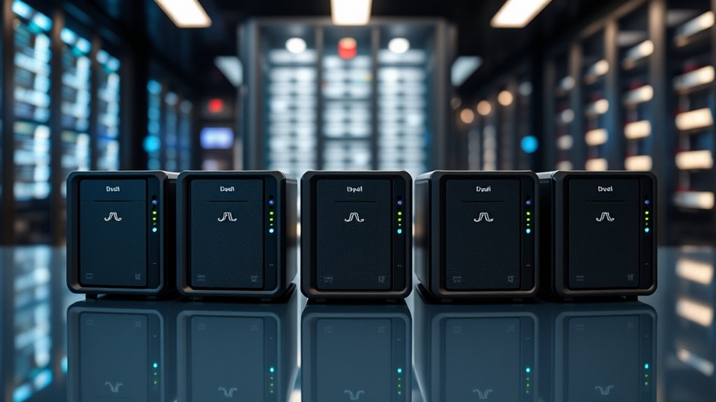 Think of NAS devices as growing trees—they can be scaled up as your data needs expand. Most models today are quite flexible, allowing you to add more drives or upgrade components to handle future growth. I find that choosing a NAS with modular design or multiple bays makes it easier to adapt. This way, I guarantee my storage keeps pace without needing a complete overhaul, saving time and money.
