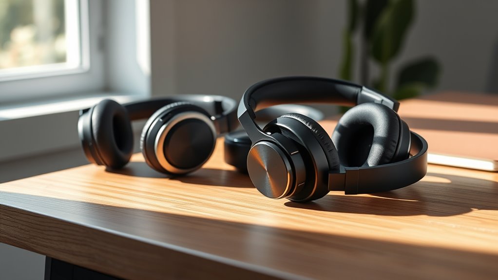 Comfort and fit play an essential role in guaranteeing an enjoyable listening experience, especially during long sessions. Properly adjustable headbands and well-padded ear cups help prevent fatigue and discomfort. Ear cups should fully encompass the ears without applying too much pressure, creating a secure seal that enhances noise cancellation without sacrificing comfort. Lightweight designs, ideally under 10 ounces, reduce strain on your head and neck during extended use. Materials like memory foam and breathable padding improve comfort and prevent heat buildup, making long listening sessions more pleasant. Additionally, a customizable fit with adjustable sliders and swiveling ear cups ensures the headphones accommodate different head sizes and shapes, delivering a tailored, comfortable experience that lets you enjoy your favorite audio without distraction or discomfort.