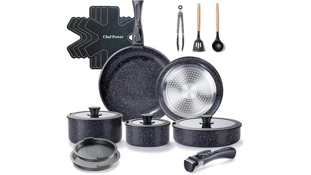 The Chef Power Nonstick Cookware Set 19 Piece stands out as an ideal choice for those who value versatile, space-saving cookware that’s easy to clean and safe for everyday use. This set includes essential pieces like saucepans, a stock pot, frying pans, and useful accessories such as silicone lids, utensils, and pot protectors. Made from durable aluminum with a ceramic nonstick coating, it supports all stove types and is oven safe up to 550°F. The removable handles and stackable design make storage effortless, perfect for small kitchens or RV living. Users appreciate its even heating, attractive look, and ease of cleaning, making it a smart, space-efficient investment.