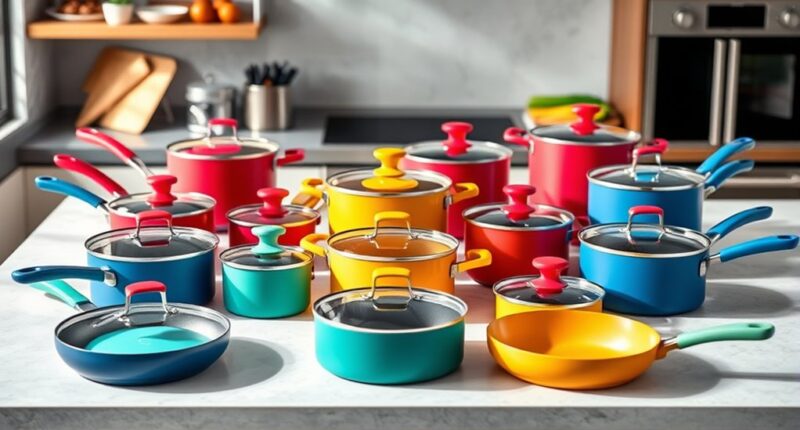 Maximizing storage space is essential in small kitchens or for those who want to keep their cabinets organized, and space-saving cookware sets make this easier by incorporating features like detachable or foldable handles. These handles allow for compact stacking and easier storage, reducing clutter. Many sets also include pot protectors and modular designs to optimize cabinet or drawer capacity. Lightweight construction and uniform sizing make nesting simple, especially in tight spaces like RVs or apartment kitchens. Multi-purpose cookware with removable handles can shift seamlessly from stove to oven or fridge, adding versatility without taking up extra space. Minimal packaging and modular components further enhance storage efficiency, ensuring your kitchen stays organized and functional. These thoughtful features help maximize every inch of your limited kitchen space.