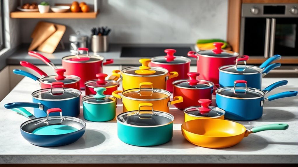 If you’re searching for the best non-stick cookware sets that make cooking easier and cleaner in 2025, I’d recommend options made from durable, reinforced aluminum with high-quality ceramic or reinforced coatings. These sets support all stove types, including induction, and are oven safe up to high temperatures. Features like stay-cool handles, vented glass lids, and dishwasher safety add convenience. Keep in mind their long-lasting construction and easy cleanup—if you continue exploring, you’ll discover more top picks suited for every kitchen need.