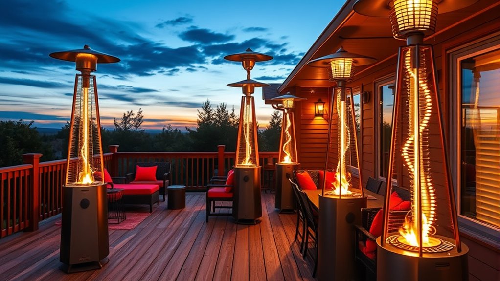 The design and aesthetic appeal of propane pyramid patio heaters play a crucial role in enhancing your outdoor space’s ambiance. Their tower or pyramid shape acts as a striking focal point, adding visual interest. Features like embossed stainless steel surfaces, heat-resistant quartz glass tubes, and decorative flames heighten their visual appeal while creating a cozy atmosphere. Color and finish options—such as stainless steel, powder-coated aluminum, or bronze—allow you to match your heater with your outdoor decor style. The glowing flame effects and ambient lighting from glass tubes further enhance the inviting vibe. Elegant and modern designs can elevate your patio’s overall look, blending functionality with style. Ultimately, a visually appealing heater complements your outdoor decor while providing warmth and ambiance.
