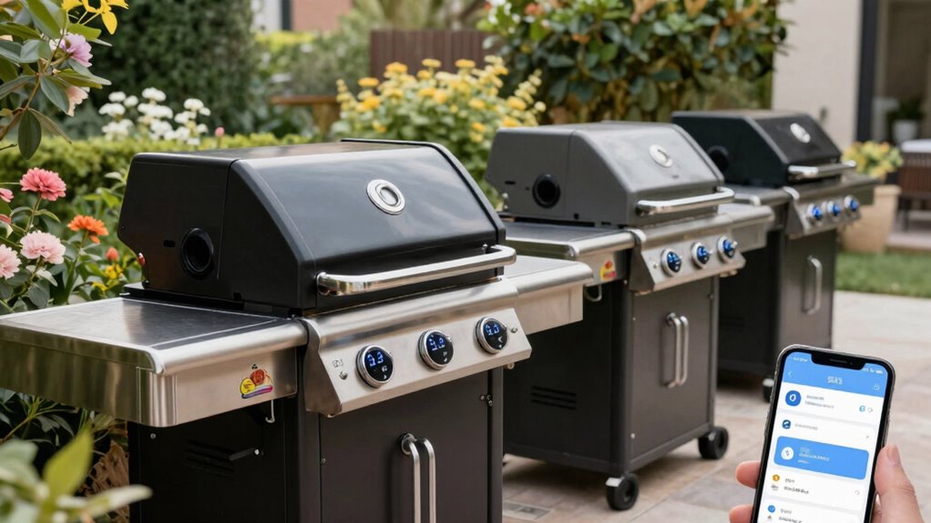 Imagine a digital symphony where everyone gets to play their part—that’s how multiple users can control these grills via WiFi. Most models I’ve seen allow several users to connect and adjust settings, like a well-orchestrated jam session. However, the number of simultaneous controllers varies by brand. I recommend checking each grill’s specific app features to guarantee everyone can join in the delicious control dance without stepping on each other’s toes.