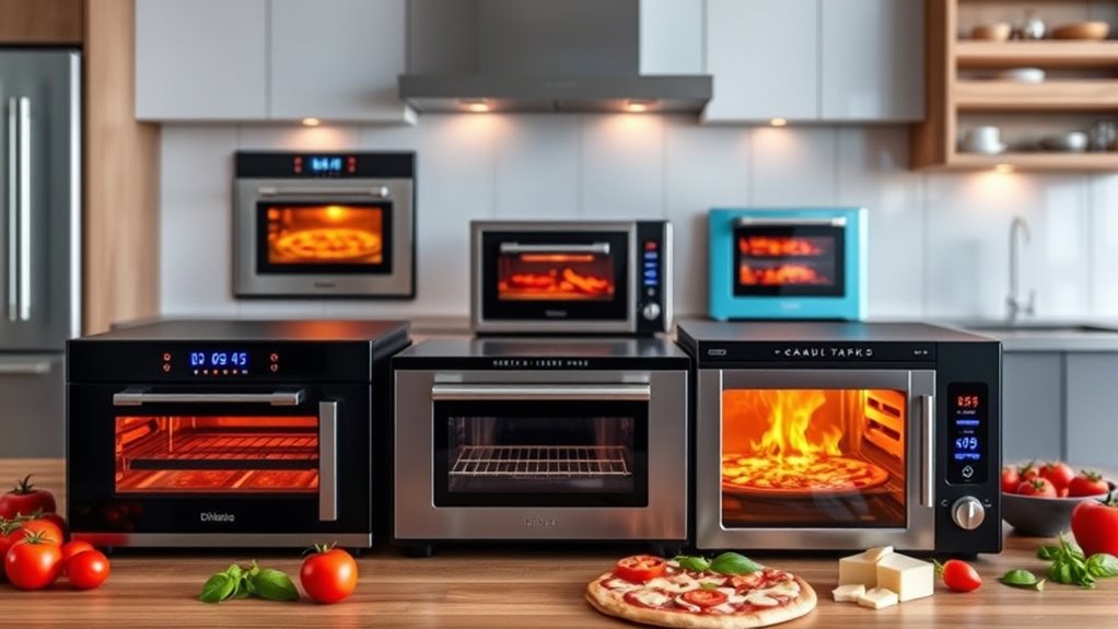 If you’re looking to upgrade your home pizza game in 2025, I’ve found the top 15 options, from versatile gas and multi-fuel models like the Ooni Koda 12 and Karu 12 to electric countertop ovens like the Granitestone Crispy Crust and Presto Pizzazz Plus. Outdoor and portable choices also make it easy to enjoy authentic wood-fired flavors. Keep analyzing these options, and you’ll find the perfect oven to suit your style and space.