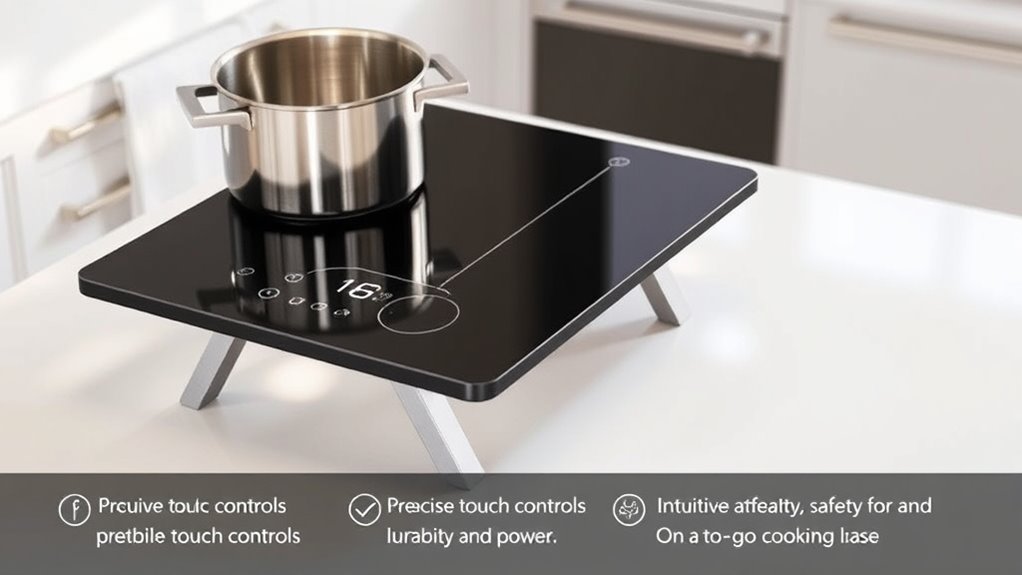 Safety features and auto functions play a vital role in making portable induction cooktops user-friendly and secure. I always look for models with automatic shut-off, which turn the cooktop off after a set time or when no cookware is detected, preventing accidents. Auto-pan detection is essential to avoid overheating or damage if incompatible or no cookware is present. Safety lock functions are a must, especially in households with children or pets, to prevent accidental activation. Over-heat protection automatically disconnects power if the unit overheats, adding another layer of safety. Additionally, low-voltage and circuit failure warnings help guarantee electrical safety during operation. These features give me peace of mind, knowing that the cooktop is designed to operate safely and minimize risks during use.