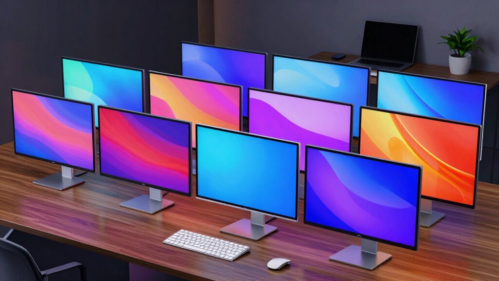 Color accuracy is a essential factor to take into account when choosing a portable 15-inch 4K monitor, especially if you work with photos or videos. One key aspect is color gamut coverage, with standards like sRGB, AdobeRGB, and DCI-P3 indicating the range of reproducible colors. Higher percentages mean more vibrant, true-to-life colors, which are critical for professional editing. Factory calibration or calibration tools help guarantee the monitor’s colors match industry standards, often aiming for a Delta E value below 2 for precision. HDR support also enhances color accuracy by expanding contrast and color range for compatible content. Additionally, color depth—8-bit versus 10-bit—affects the number of colors displayed, impacting subtle gradation reproduction and overall color fidelity.