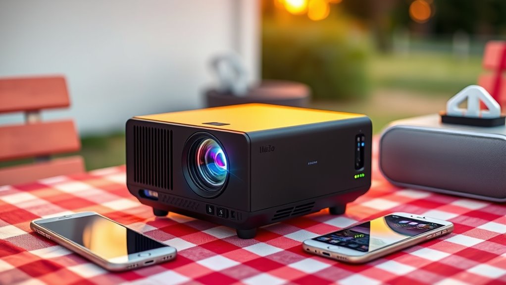Choosing a portable projector also means paying attention to its power and battery life, since these factors determine how long you can enjoy your movies or presentations without interruption. Longer battery life allows for extended viewing sessions, with some models supporting up to 2.5 hours on a single charge. Built-in rechargeable batteries eliminate the need for external power sources, making outdoor use and spontaneous movie nights possible. Keep in mind, lighter models tend to have shorter battery durations, so balance portability with runtime. Fast-charging technology is a big plus, reducing downtime and keeping you ready quickly. Also, battery performance can decline over time, so consider models with longer cycle life or replaceable batteries to guarantee consistent power and reliability over the years.