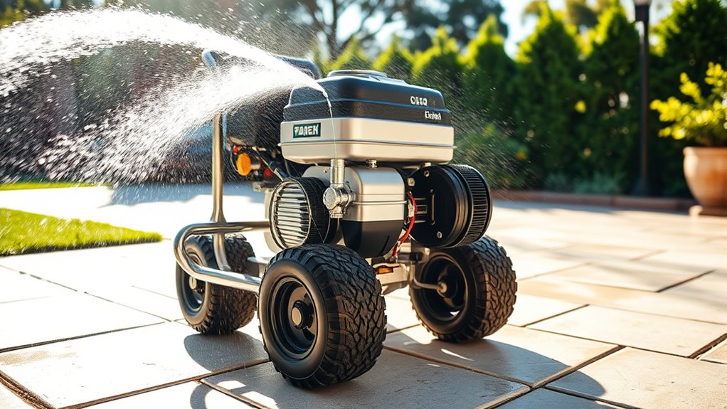 Portability and ease of use are essential factors to take into account because a heavy-duty pressure washer should be manageable enough to transport and operate comfortably. I recommend choosing a model around 60 pounds, which strikes a good balance between power and mobility. Look for features like large, pneumatic tires—say, 10 or 13 inches—that make moving over different terrains smooth and effortless. A lightweight frame, such as aluminum or steel with a compact design, helps reduce fatigue during longer jobs. Additionally, a longer, flexible hose—ideally 25 to 30 feet—maximizes reach and minimizes repositioning. Handles, hose reels, and storage compartments for accessories also enhance maneuverability and simplify storage, making your cleaning tasks more efficient and less tiring.