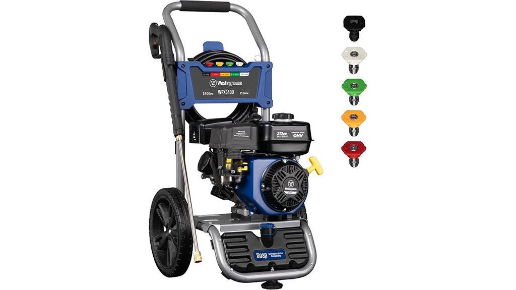 For those tackling tough cleaning jobs around their property, the Westinghouse WPX3400 gas pressure washer stands out with its powerful 3400 PSI and 2.6 GPM flow rate. It’s perfect for heavy-duty tasks like cleaning decks, fences, driveways, siding, and vehicles. Powered by a reliable 212cc 4-stroke engine and featuring a maintenance-free axial cam pump, it offers strong performance and mobility. The unit includes a built-in soap tank, five quick-connect nozzles, and durable 12-inch never-flat wheels. Easy to assemble and operate, it’s designed to handle demanding cleaning projects with efficiency, making it a top choice for both homeowners and professionals.