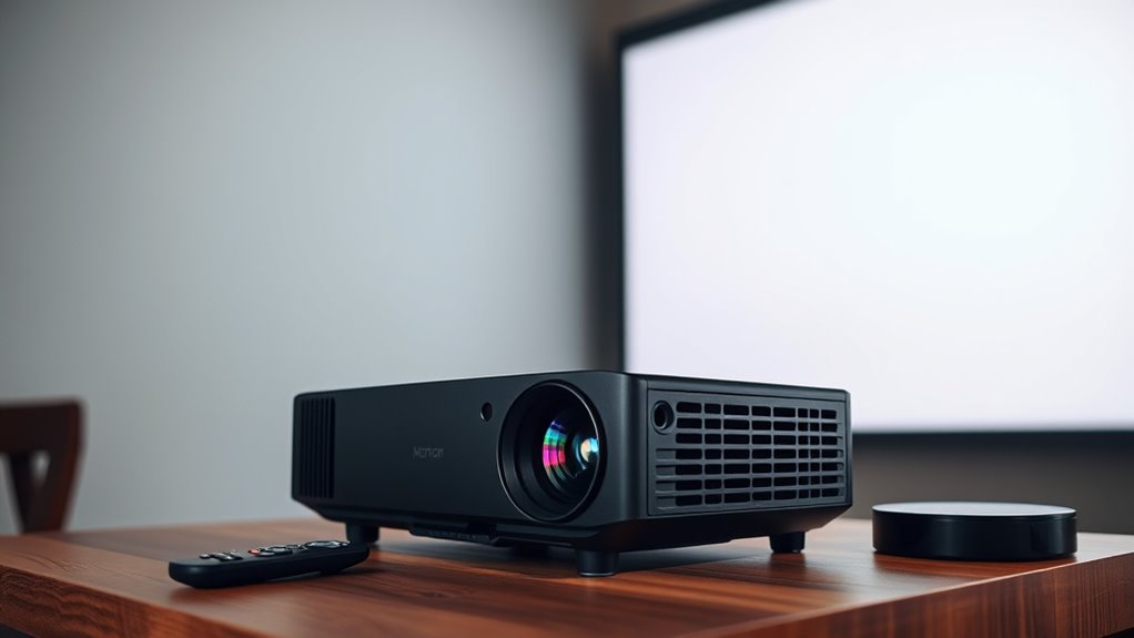 A projector’s ease of setup can make or break your viewing experience, especially if you’re enthusiastic to start watching quickly. I look for models with automatic keystone correction and auto-focus, which keep the image sharp and properly aligned without manual adjustments. Connectivity options like HDMI, USB, and wireless streaming are vital for quick setup and seamless device pairing. Simple installation processes, with minimal wiring and intuitive menu navigation, save time and frustration. Adjustable projection angles, such as 270° or 360° stands, give me flexibility to position the projector easily in different spaces. Clear, responsive remote controls or app-based controls also enhance convenience, especially when I need to make quick adjustments or operate the projector from a distance. Overall, these features make setup straightforward and hassle-free.