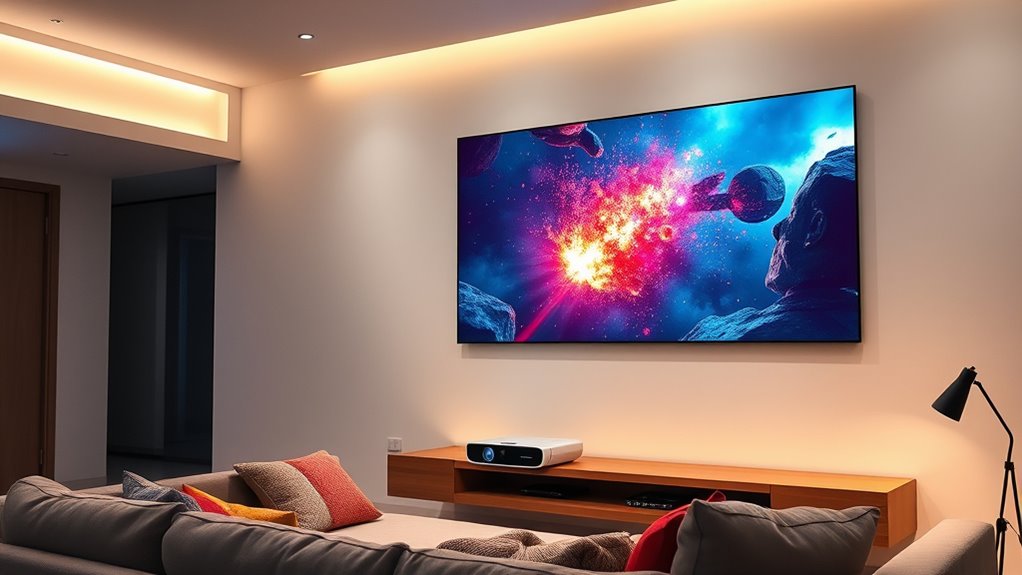 Brightness plays a crucial role in guaranteeing your projector delivers clear and vibrant images, especially in environments with ambient light. Higher lumens mean brighter images, which are essential when watching in well-lit rooms or outdoors. For daytime use or large screens, I recommend at least 2000 lumens to maintain clarity and color vibrancy. Ambient light can wash out images, so darker rooms provide a better viewing experience, but adjustable brightness settings help optimize picture quality in varying conditions. Larger screens require more lumens to keep images sharp and vivid. If you plan outdoor or brightly lit setups, a projector with 1500-2000 lumens or more is ideal. Choosing the right brightness ensures your content looks its best, no matter where you watch.
