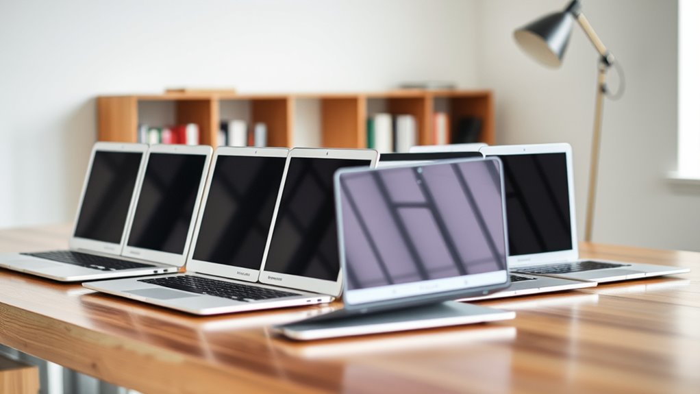 When choosing a renewed MacBook Air, I focus on key factors like performance, battery life, and display quality to guarantee it meets my needs. I also consider storage options and price to get the best value for my budget. By keeping these points in mind, I can find a device that balances functionality and affordability.