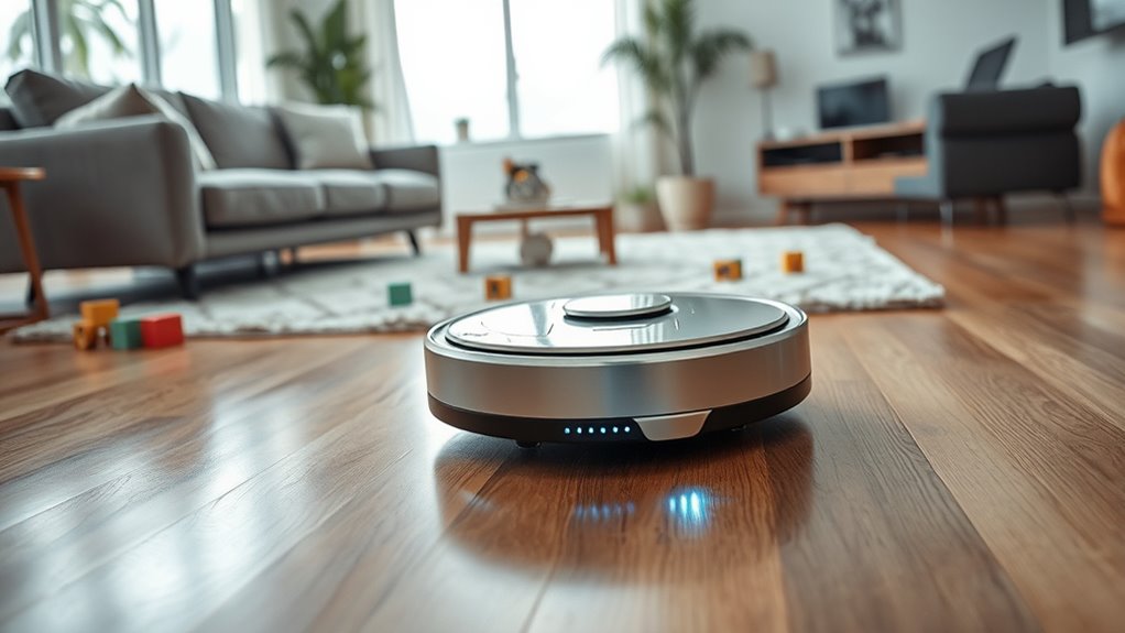 Choosing a robot vacuum with advanced navigation and mapping features guarantees thorough and efficient cleaning. These systems, like LiDAR or laser sensors, create precise, real-time maps of your home, allowing the vacuum to plan ideal routes. Many models can store multiple floor plans, recognize different rooms, and set designated zones or no-go areas, giving you customized control. Intelligent obstacle avoidance helps the robot detect furniture, cords, and small objects, reducing the chances of getting stuck or missing spots. Some vacuums can remember and label rooms, enabling targeted cleaning schedules and smarter route planning. Plus, the ability to update and refine maps over time means the vacuum adapts to changes in your home, ensuring consistent, extensive coverage with less effort on your part.