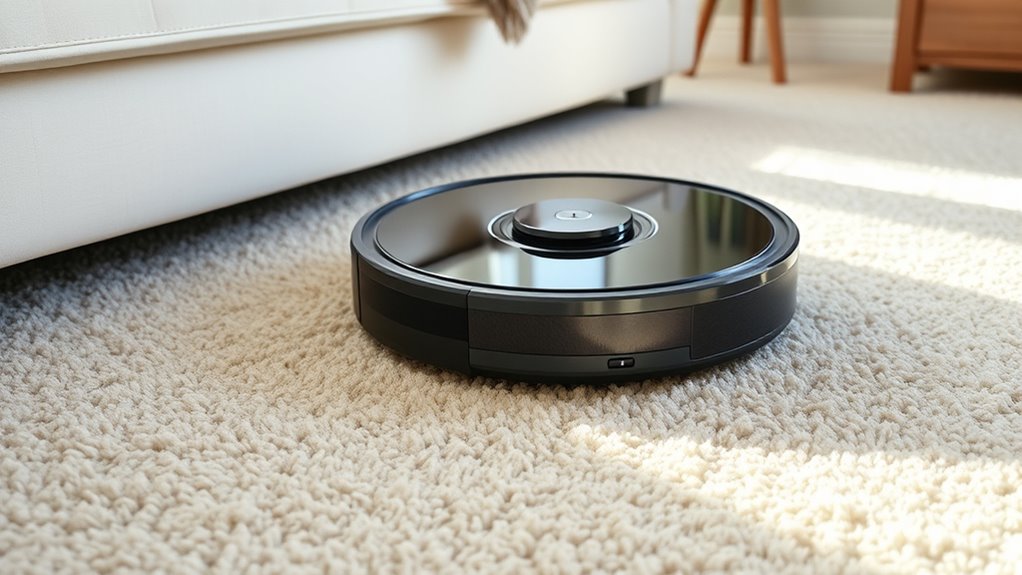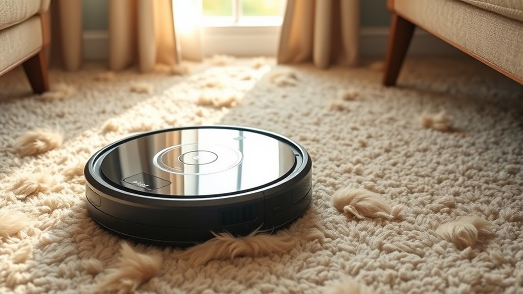Since navigation accuracy directly impacts how effectively a robot vacuum cleans pet hair, understanding the sensor technology behind it is vital. Sensors like LiDAR, cameras, or gyroscopes help the vacuum create detailed maps of your home, enabling thorough cleaning and smart routing around pet hair and obstacles. Advanced systems can recognize hazards such as cords or fragile items, reducing the risk of getting stuck or damaging your belongings. Precise navigation also allows the robot to focus on areas with higher pet hair buildup, improving overall efficiency. Consistent accuracy minimizes missed spots and avoids unnecessary passes, which is especially important for deep cleaning carpets and tight spaces. Choosing a vacuum with reliable navigation ensures more effective, efficient, and hassle-free pet hair removal.