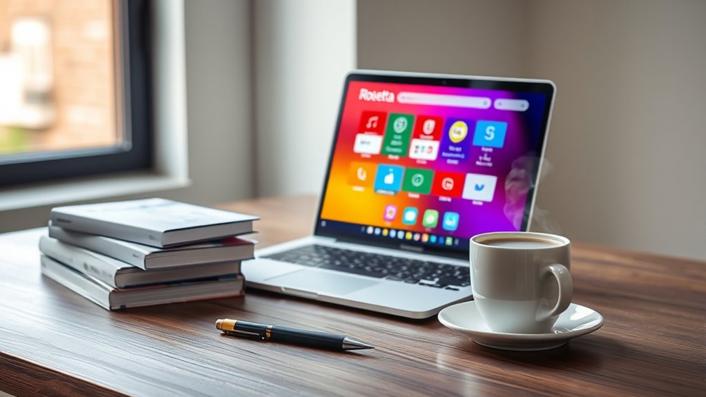 Choosing a Rosetta Stone lifetime subscription means you’ll want to guarantee you stay up-to-date with the latest features and content without surprises. Most lifetime plans include automatic updates, so you don’t have to worry about manual downloads or missing out on new courses and improvements. It’s important to confirm whether renewal is required later; ideally, it’s a one-time payment with no additional fees. Check how frequently updates occur and what they include—whether new lessons, platform enhancements, or features. The process should be seamless, with updates delivered automatically whenever available. Additionally, verify that ongoing support and updates are included at no extra cost throughout your subscription’s lifetime. This ensures you get continuous value without unexpected charges or disruptions.