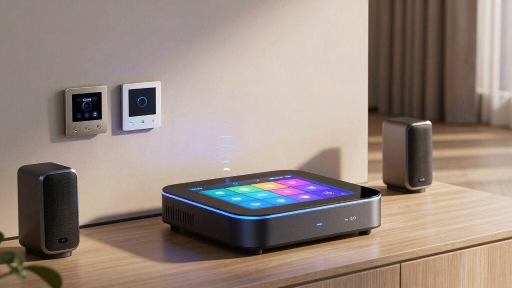 Choosing a smart home hub that seamlessly integrates with your existing devices requires careful attention to compatibility factors. First, confirm the hub supports the protocols your devices use, like Zigbee, Z-Wave, or Thread, for smooth operation. It’s also essential that the hub is compatible with the latest Matter standard, securing your setup’s future-proofing. Check if the hub connects to various device types, including sensors, switches, lighting, and appliances, to maximize compatibility. Supporting third-party integrations through official or community-developed apps and drivers is a big plus, expanding your options. Finally, verify if the hub receives firmware updates, guaranteeing ongoing compatibility with new devices and emerging standards. This way, your smart home remains flexible, scalable, and ready for future innovations.