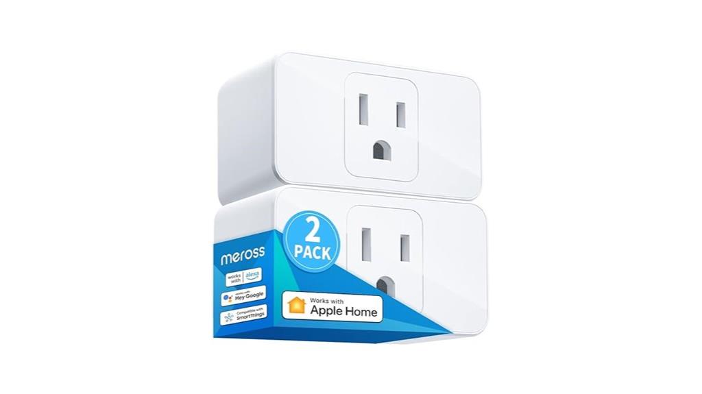 The Meross WiFi Dual Smart Plug 2 Pack stands out as an ideal choice for smart home enthusiasts seeking reliable, Apple HomeKit-compatible devices that can control two outlets separately. Its compact 2-in-1 design with wide spacing prevents interference, making it perfect for tight spaces. With support for Siri, Alexa, Google, and SmartThings, it offers flexible voice control and automation options. Easy to set up via the app, it provides stable WiFi connectivity, even over longer ranges. Users appreciate the ability to control each outlet individually, whether for lamps, Christmas lights, or other devices, all while fitting seamlessly into various smart home ecosystems.