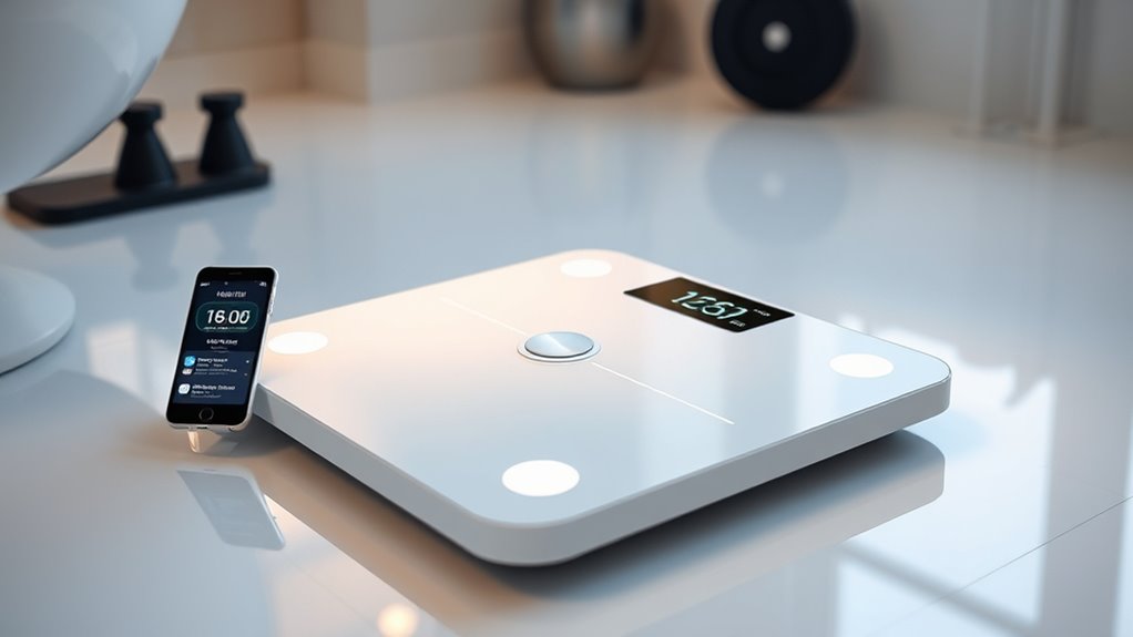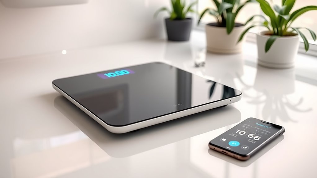 You’d think calibrating a smart scale would be as exciting as watching paint dry, right? Honestly, I check mine every few months or if I notice inconsistent readings. Regular updates from the manufacturer help keep data precise, so I make sure to download firmware updates promptly. Staying on top of calibration and updates guarantees my scale gives me trustworthy insights—because who wants to base health decisions on faulty data?