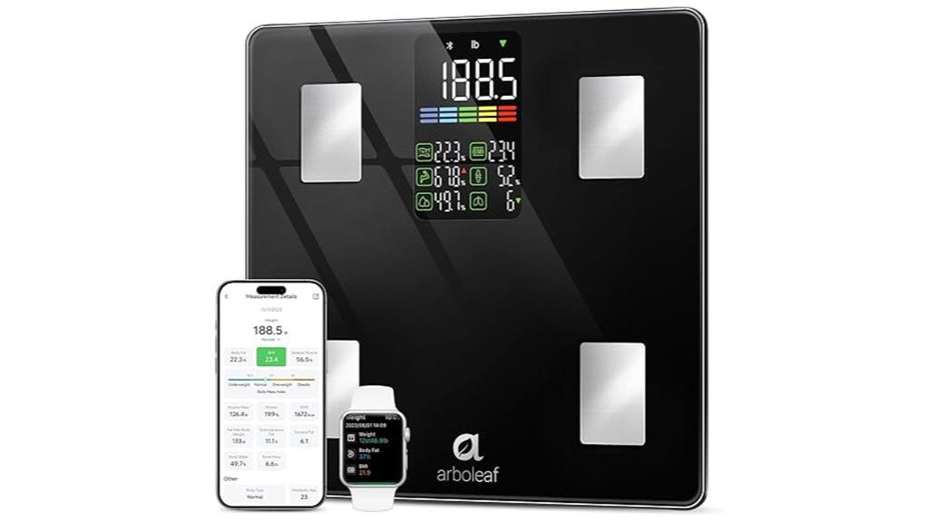 The Arboleaf Smart Scale stands out for its extensive body composition metrics and user-friendly features, making it an excellent choice for anyone serious about tracking their health. It measures 14 metrics, including weight, BMI, body fat, muscle mass, water, visceral fat, and bone mass, providing a thorough health overview. The scale’s bright LED display ensures easy reading, while its four high-sensitivity sensors guarantee precise measurements up to 0.1 lb. With seamless app integration and support for multiple users, it’s perfect for families. Despite some minor variability, users find it reliable, durable, and valuable for achieving health goals.
