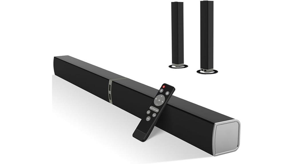 The MZEIBO Bluetooth Sound Bar for Smart TV stands out as an ideal choice for those seeking versatile, high-quality audio in a compact design. Its 80W power and four drivers deliver immersive 360° stereo sound with deep bass and clear highs, perfect for movies, gaming, and music. The detachable 2-in-1 design lets me split it into two towers or keep it as a single long bar, offering flexible placement options. It supports Bluetooth 5.0, ARC, Optical, and AUX, ensuring broad device compatibility. Easy to set up, it includes a remote and mounting accessories, making it a convenient, powerful addition to any home entertainment system.