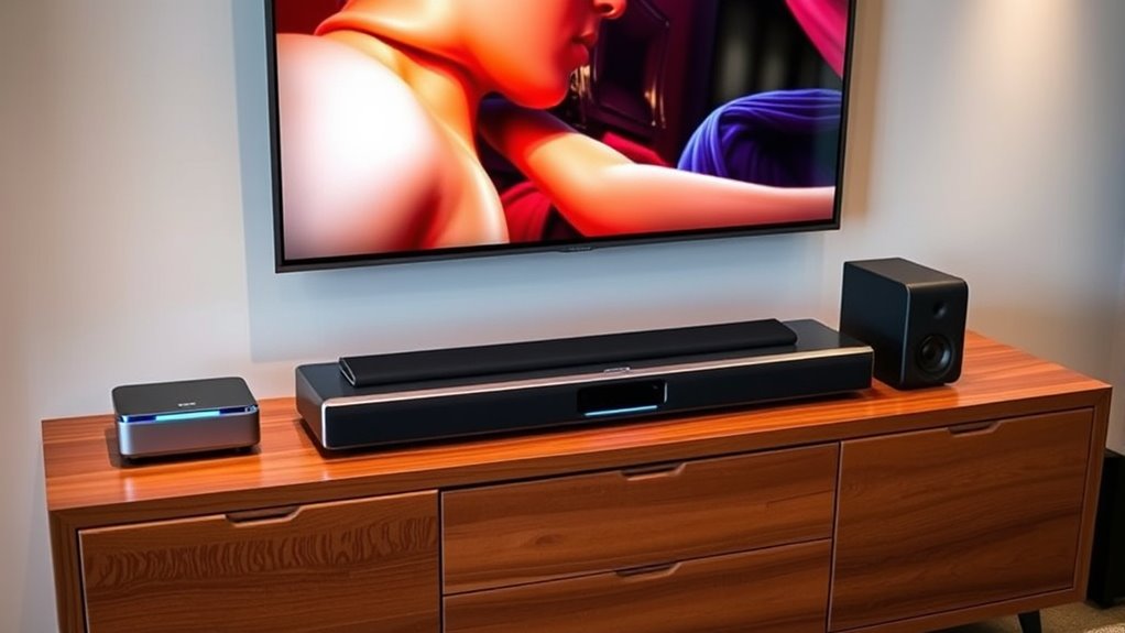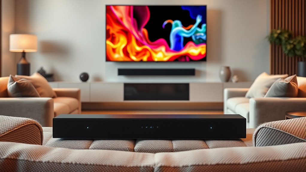Finding a soundbar that fits well into your space requires paying close attention to its size and design. Measure your available area to guarantee the soundbar isn’t too bulky or too small for your TV setup. Consider the room’s decor—sleek and modern or minimal and unobtrusive—and choose a style that complements it. Think about the shape and mounting options; wall-mountable models save space and offer a clean look, while tabletop units are easier to reposition. If you plan to move your soundbar often, check its weight and portability. Remember, larger soundbars suit bigger rooms, providing richer sound, while smaller models are perfect for compact spaces. Ultimately, selecting the right size and style ensures seamless integration into your viewing environment.