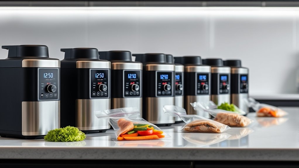 In 2025, I found that the top sous vide machines combine powerful wattage, precise temperature control, and smart features like Wi-Fi connectivity for easy remote operation. Models like the Anova Precision Cooker 3.0 and Inkbird ISV-200W offer fast heating, durability, and user-friendly interfaces. Whether you’re a beginner or a pro, these units assure restaurant-quality results. Keep exploring to discover detailed insights about the best options that help you cook perfectly every time.