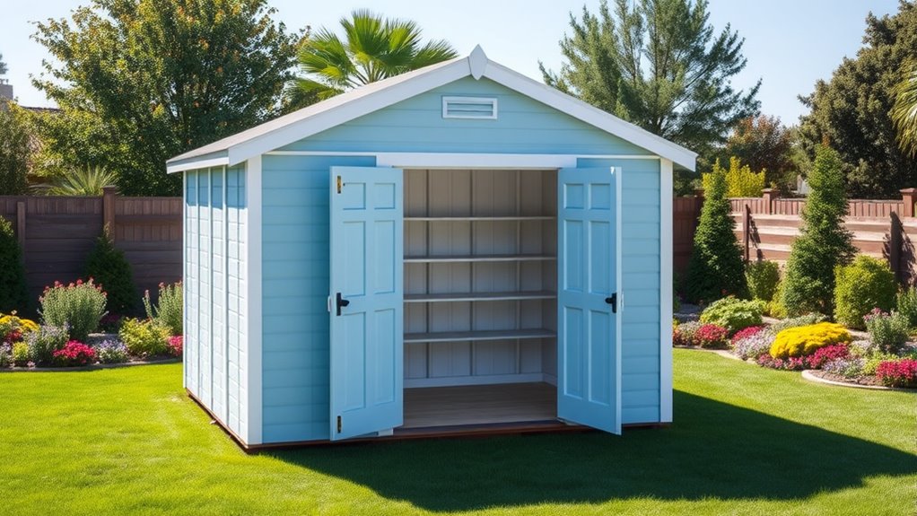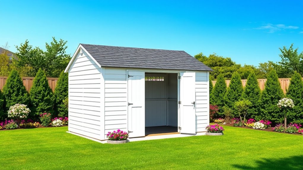 Selecting the right size and capacity for your storage shed is essential to guarantee it meets your current and future needs. First, measure your outdoor space to ensure the shed fits comfortably without blocking pathways or landscaping. Think about what you’ll store now and any items you might add later, aiming for a size that allows organized storage with features like tall shelves or compartments. Keep in mind that larger sheds often take longer to assemble, need a sturdy foundation, and can cost more. To compare options effectively, consider the volume in cubic feet or square footage. Choosing a shed that balances ample capacity with practicality ensures you get a functional, efficient storage solution tailored to your backyard.