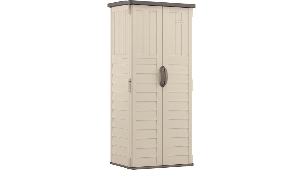 The Suncast Vertical Outdoor Storage Shed is an ideal choice for homeowners seeking a compact, durable solution to organize long-handled tools, gardening supplies, and outdoor essentials. Its sleek, vertical design with a neutral vanilla finish blends seamlessly into any yard or garage. Made in the USA, it features all-weather resin panels that resist rain, sun, and wear, ensuring long-term durability. The reinforced floor adds stability, while the lockable double doors with a padlock hasp provide security. Easy to assemble with clear instructions, it’s perfect for small spaces. Overall, this shed offers a practical, weatherproof, and secure storage option that’s both functional and visually appealing.