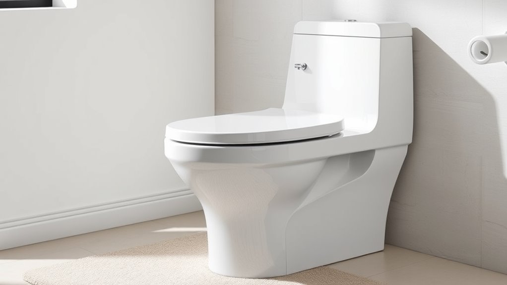 A well-designed elongated comfort-height toilet not only enhances your bathroom’s look but also makes maintenance simpler. Toilets with smooth, glazed surfaces like nano self-cleaning ceramic or CEFIONTECT glaze resist stains, making cleaning easier and reducing buildup. Many models feature quick-release or removable seats, allowing you to clean both the seat and bowl thoroughly. Skirted or fully-closed trapway designs eliminate hard-to-reach crevices, minimizing dirt accumulation and simplifying wipe-downs. Regular maintenance should include cleaning nozzles, filters, and seals, especially in bidet-integrated models, to prevent clogs and maintain hygiene. Choosing toilets with auto self-cleaning nozzles or built-in deodorizing features can further reduce manual cleaning, keeping your bathroom fresh and hygienic with less effort.