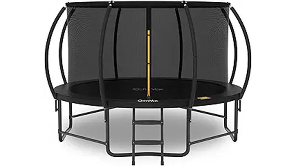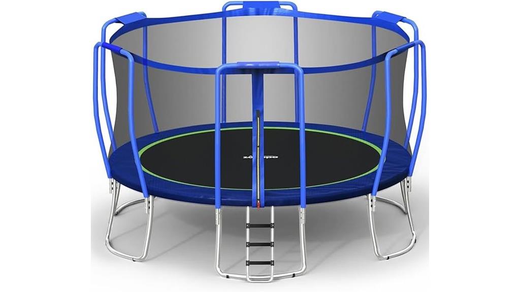 The JUMPZYLLA Outdoor Trampoline with Enclosure and Ladder stands out as an excellent choice for families seeking a safe and durable outdoor recreation option. It complies with ASTM safety standards, featuring curved poles to prevent injuries and a secure enclosure net. The galvanized stainless steel frame is rust-resistant and built for longevity, with waterproof foam padding for added durability. Easy to assemble, it includes a sturdy plastic ladder, wind stakes, and safety guides. Available in sizes from 8 to 16 feet, it offers ample space for kids and adults alike. Its innovative design and reliability make it a top pick for safe, fun outdoor bouncing.
